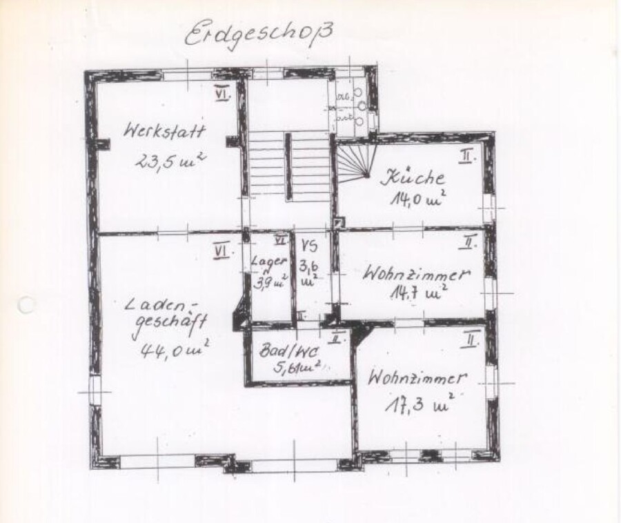 Angeboten wird ein Ensemble aus zwei Häusern. Während sich im hinteren Bereich des Grundstücks ein Einfamilienhaus befindet, steht auf dem vorderen Teil ein Wohn- und Geschäftshaus.