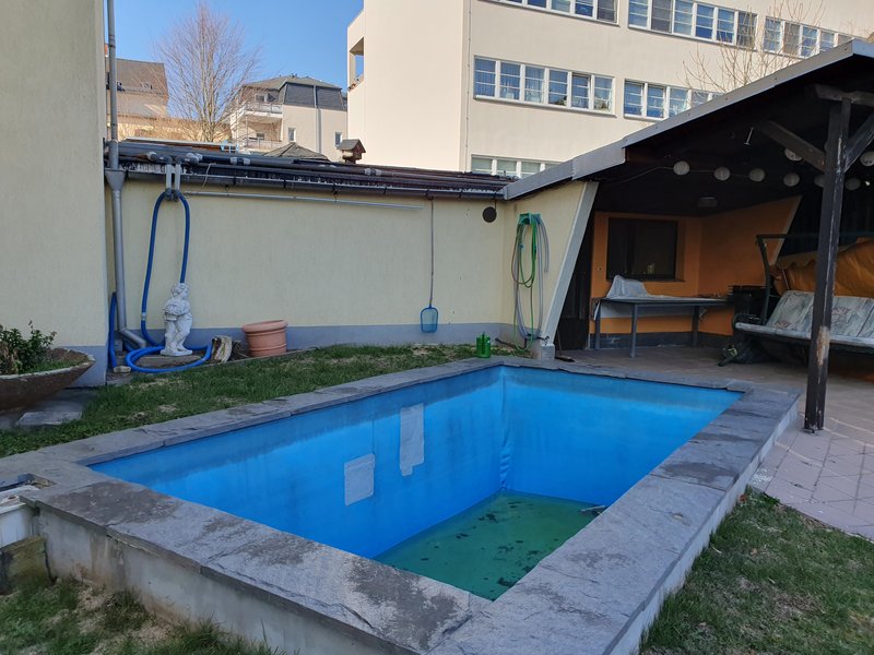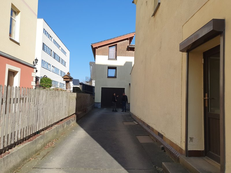 Im Hinterhaus sind auf 3 Etagen etwa 92 m² Wohnfläche vorhanden. 4 Wohnräume mit 2 Bädern sowie Küche und Werkstatt werden ergänzt durch eine Garage im Haus. Zum Gebäude gehört ein kleiner Garten mit einem sanierungsbedürftigen Pool und einem Schuppen.