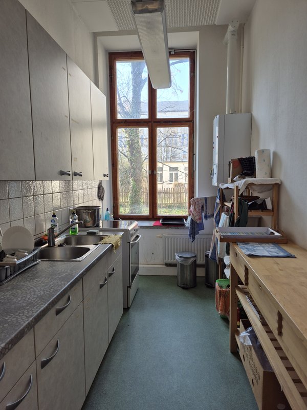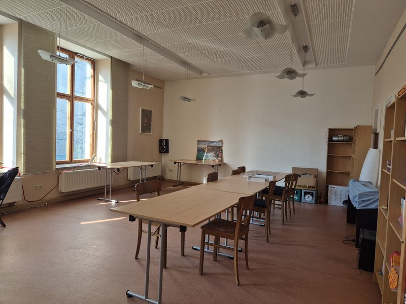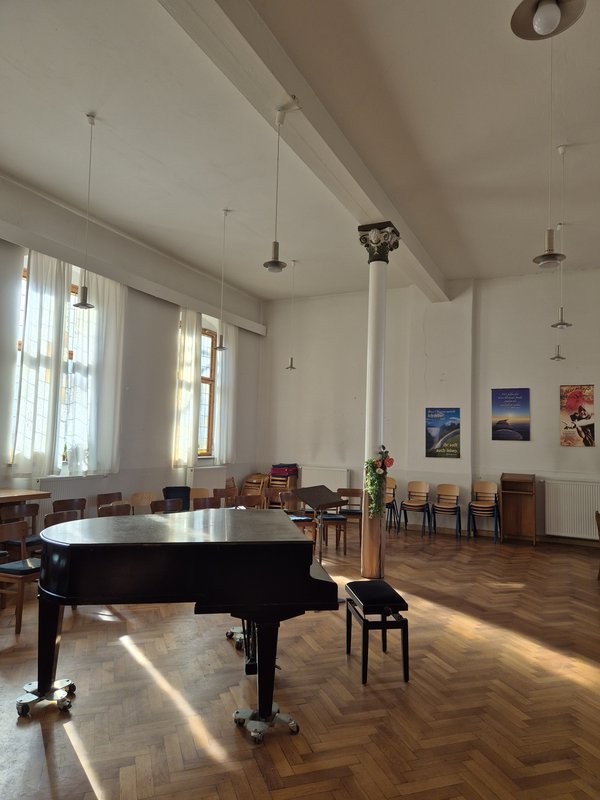 Angeboten wird ein Hinterhaus mit 2 Vollgeschossen plus ausgebautem DG sowie einem eingeschossigen Anbau. Das EG umfasst auf einer Fläche von ca. 214 m², einen großen Saal mit 102 m², der peripher noch von der Schlossgemeinde genutzt wird sowie einen separat begehbaren großen Veranstaltungsraum inkl. Teeküche und Toiletten im Anbau.